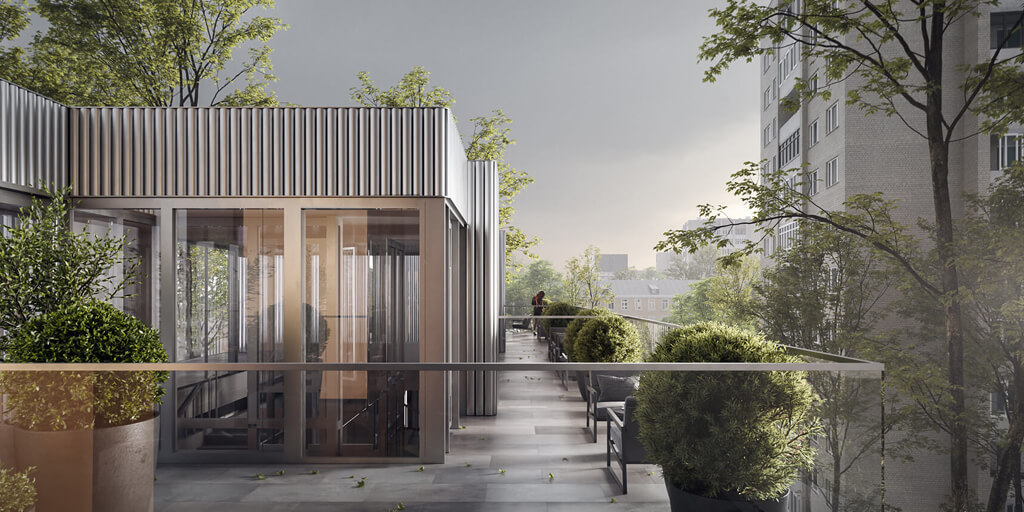 Каждая вилла оснащена собственной террасой на крыше — это приватное просторное пространство, откуда открываются виды на исторические крыши Москвы, купола храмов и городские силуэты. Такие террасы предназначены для отдыха, утреннего кофе или вечерних встреч с близкими, они создают ощущение личного пространства и эмоционального продолжения дома. Зеленые архитектурные формы и ландшафтный дизайн подчеркивают гармонию между природой и архитектурой.