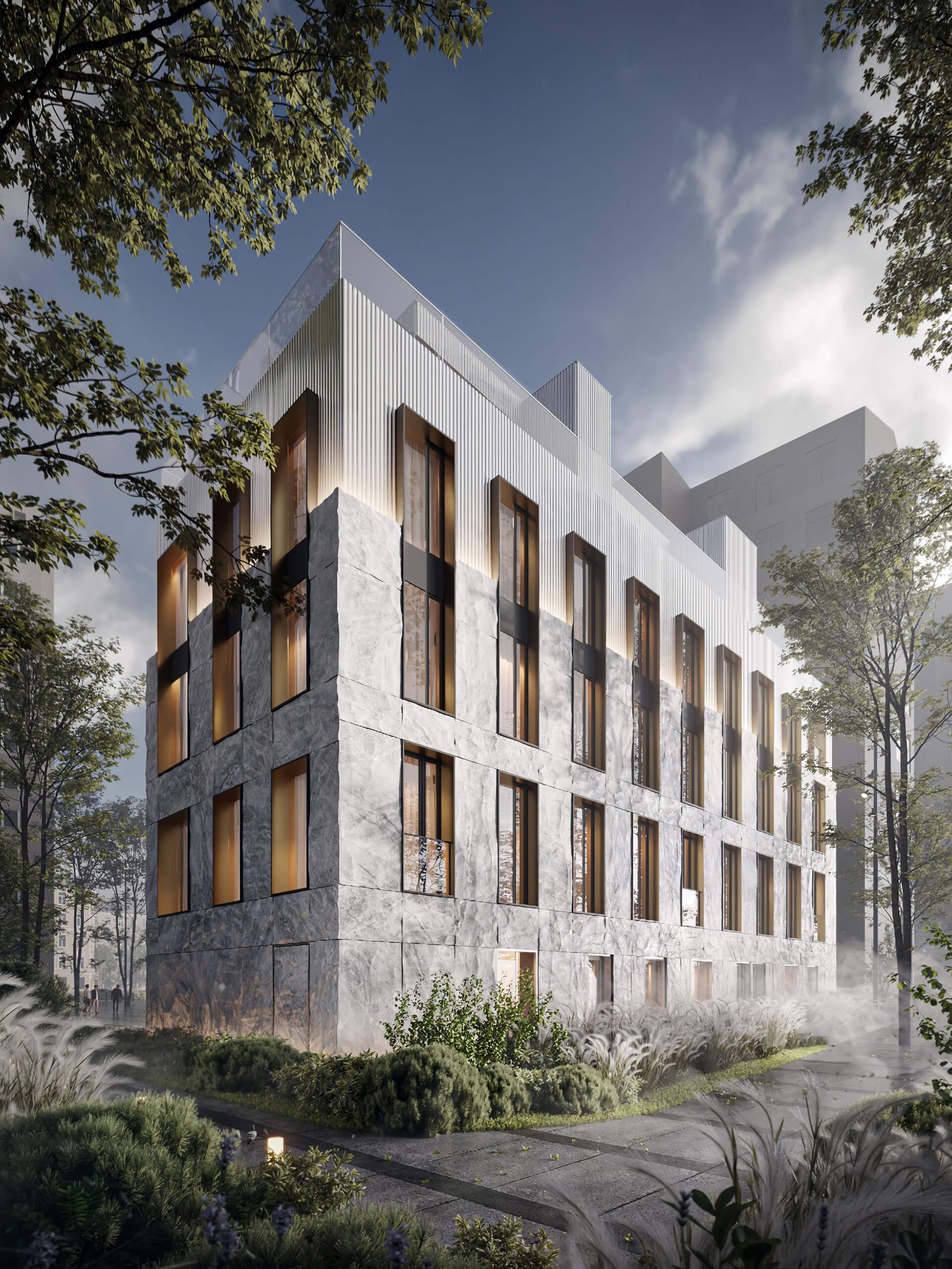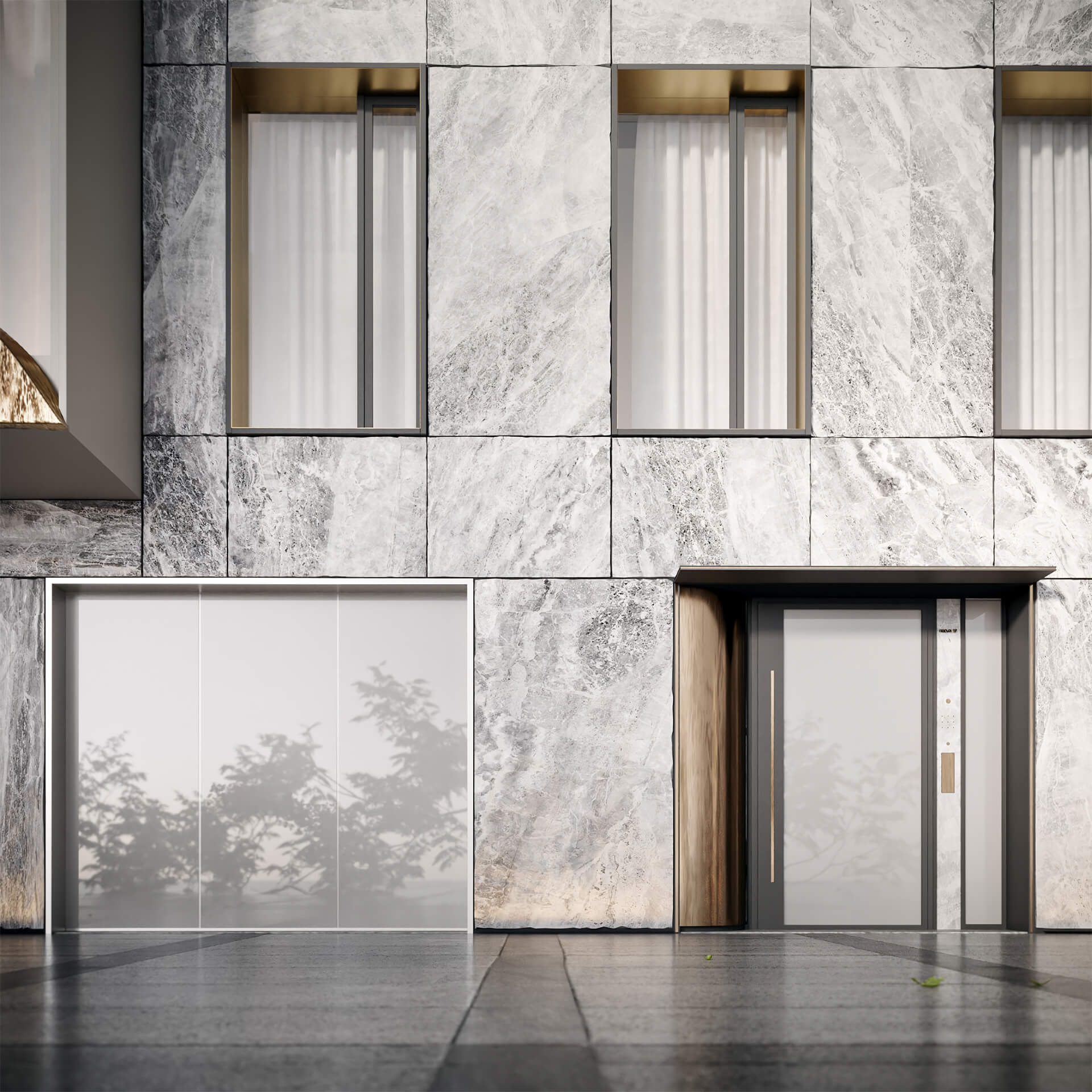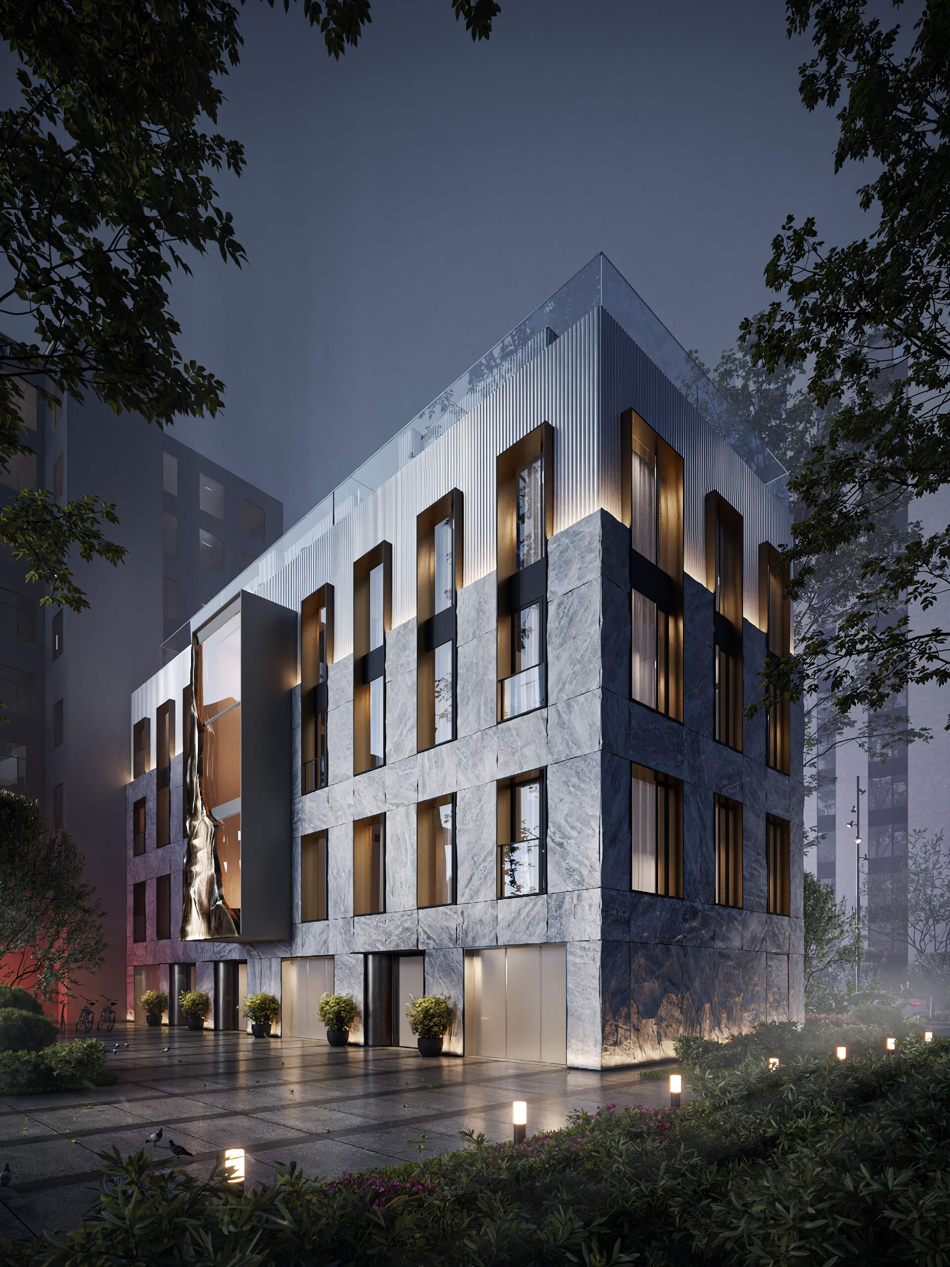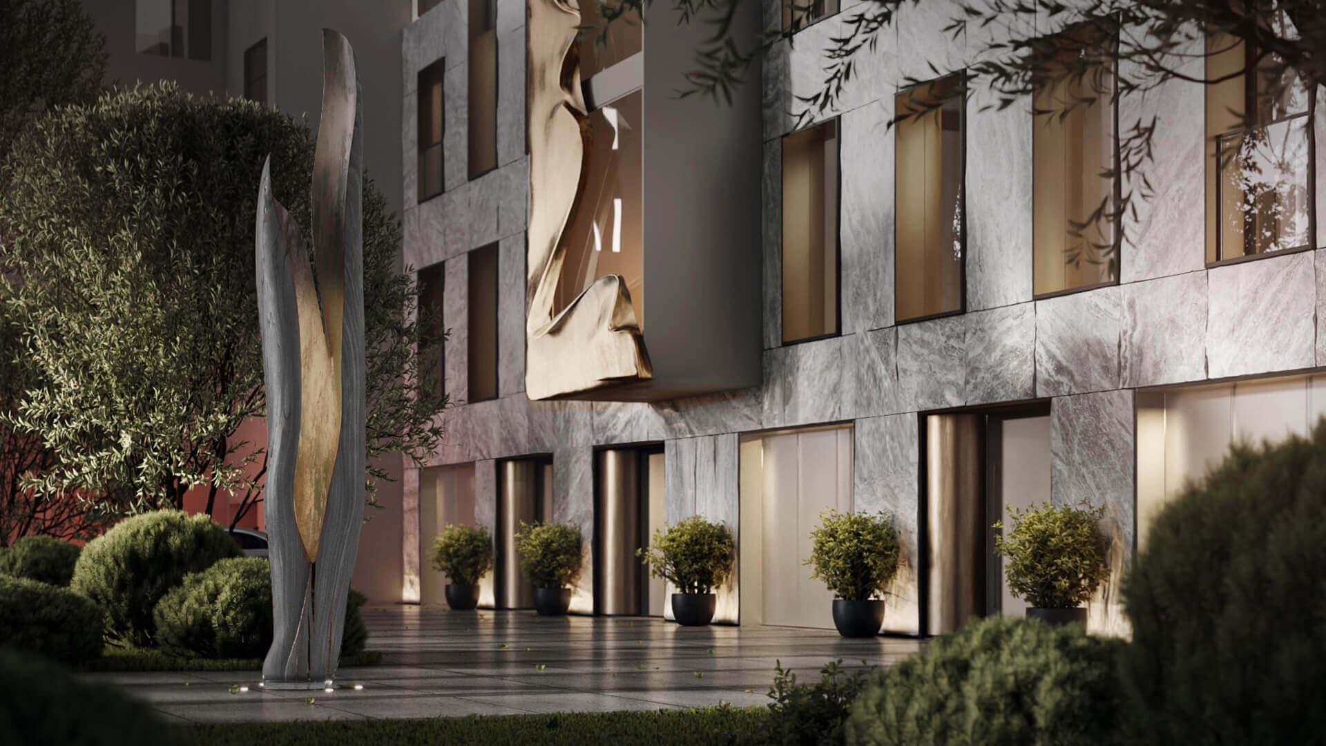 Фасад комплекса украшает скульптура, созданная художником Дашей Намдаковым — это центральный декоративный элемент, который несёт культурную и философскую нагрузку, одновременно подчеркивая уникальность и статус проекта. Архитектурный язык объединяет натуральные материалы — металл, латунь, камень — с современными формами, создавая гармоничное взаимодействие между городским контекстом и высоким архитектурным стилем. Такой подход превращает виллы в символ эстетики, изысканности и долговечности.