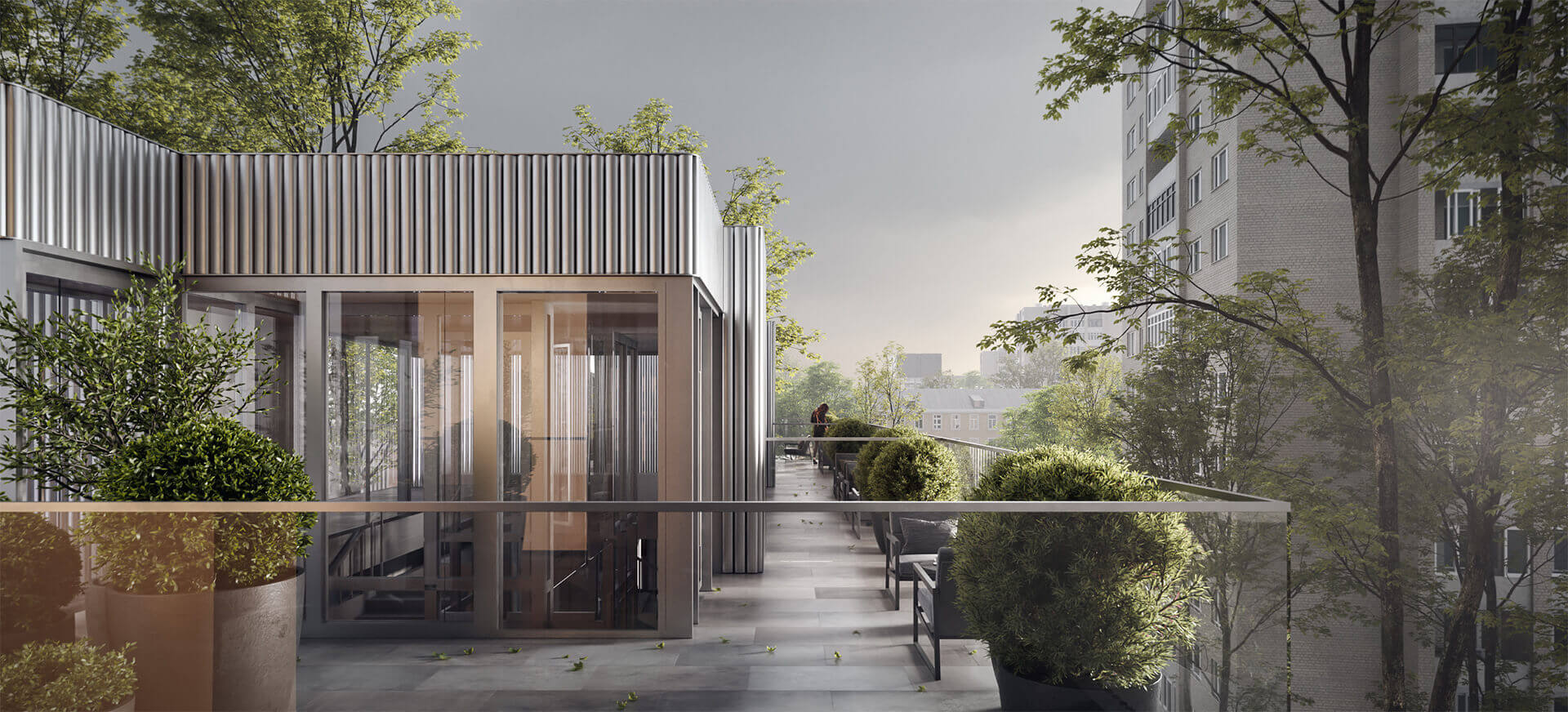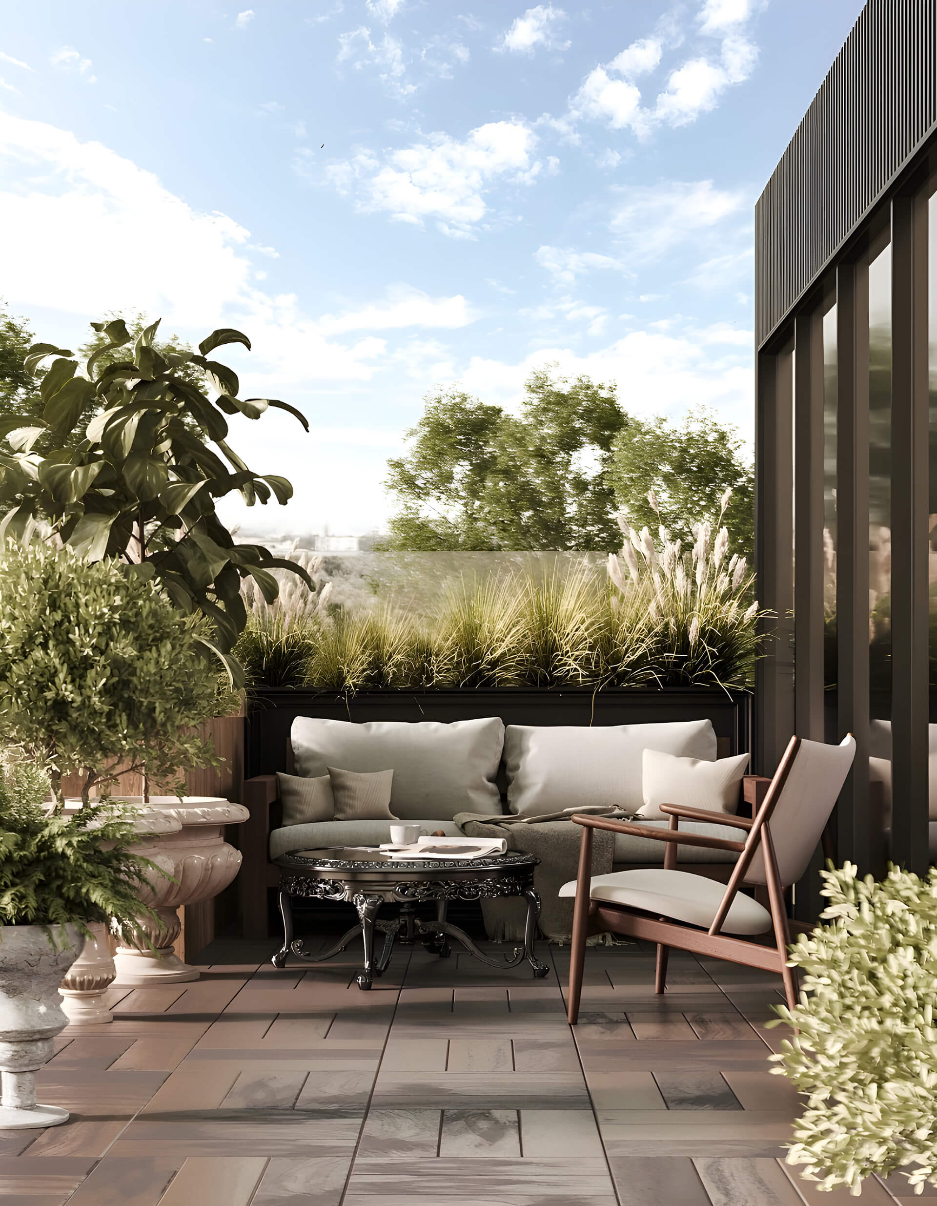 Каждая вилла оснащена собственной террасой на крыше — это приватное просторное пространство, откуда открываются виды на исторические крыши Москвы, купола храмов и городские силуэты. Такие террасы предназначены для отдыха, утреннего кофе или вечерних встреч с близкими, они создают ощущение личного пространства и эмоционального продолжения дома. Зеленые архитектурные формы и ландшафтный дизайн подчеркивают гармонию между природой и архитектурой.
